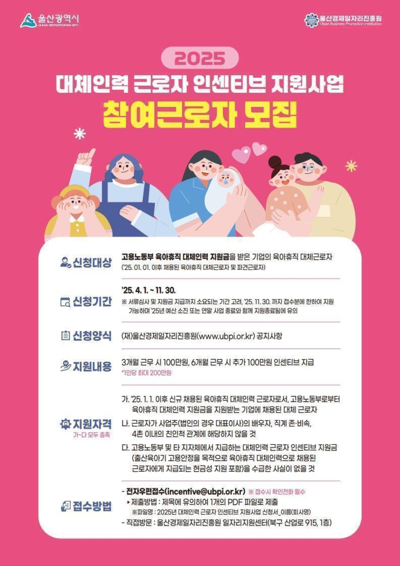 이 사업은 울산 소재 중소기업에 채용된 육아휴직 대체인력 근로자가 일정 기간 이상 지속해 근무할 경우 1인당 최대 200만 원의 특전(인센티브)을 지원하는 사업이다.