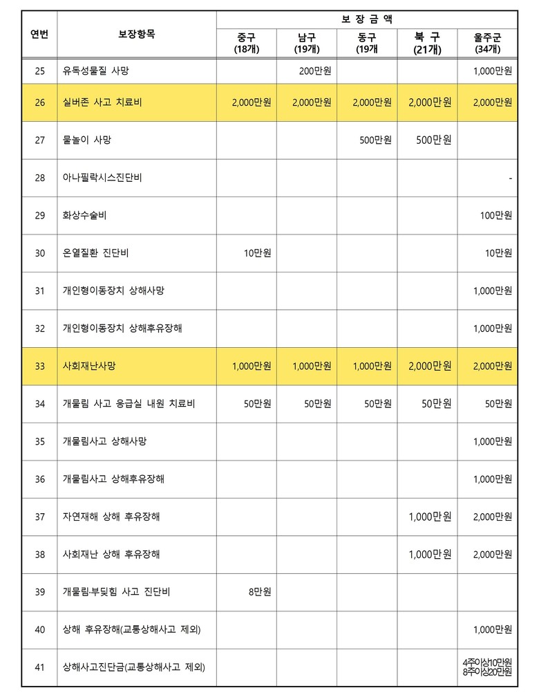보상 대상자는 울산시에 주민등록이 되어 있는 시민으로 별도의 가입 절차 없이 자동으로 보험에 가입된다.