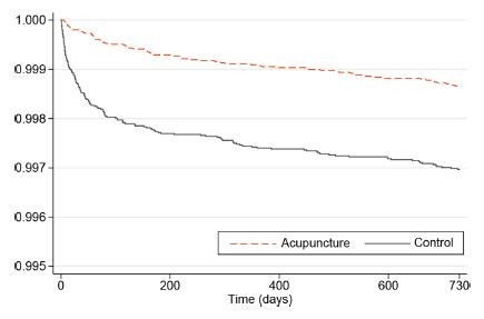 카플란 메이어(Kaplan-meier) 생존분석에서도 침치료군이 대조군 보다 높은 누적생존율을 보였다. 시간의 경과에 따라 침치료군의 누적생존율은 대조군 보다 완만하게 떨어지는데, 이는 침치료군의 경추수술률이 대조군 보다 낮다는 것을 의미한다.