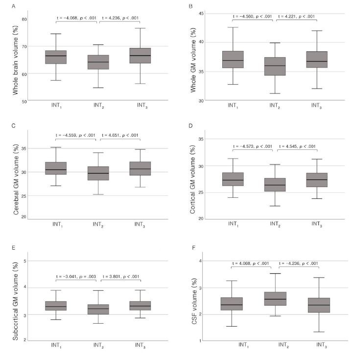 또, 평균 기상시간과 뇌 MRI 촬영 시간의 간격(INT)에 따라 INT1(짧은/420분), INT2(중간), INT3(긴/636분 이상) 3개 그룹으로 분류했다. 뇌 MRI 촬영으로 전체 뇌 부피, 회질(whole gray matter), 대뇌 회질(cerebral gray matter), 외피 회질(cortical gray matter), 하부 피질 회질(subcortical gray matter), 뇌척수액 수치를 확인했다.