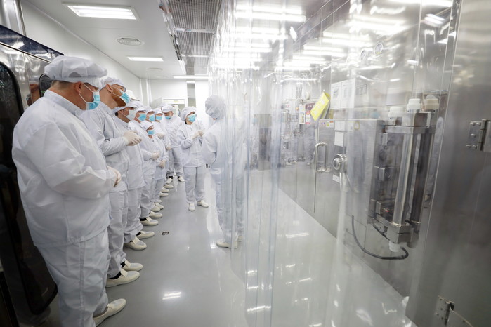 | ▲세계수기근골의학연합회(FIMM) 이사회 멤버들이 자생한방병원 남양주원외탕전실의 약침 조제 공정을 살피고 있다. |