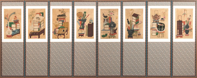 책거리 병풍은 선비들이 늘 가까이 했던 서책이나 화병 등을 그린 그림을 병풍 형태로 제작한 것으로 책가도, 문방도라고도 불린다.