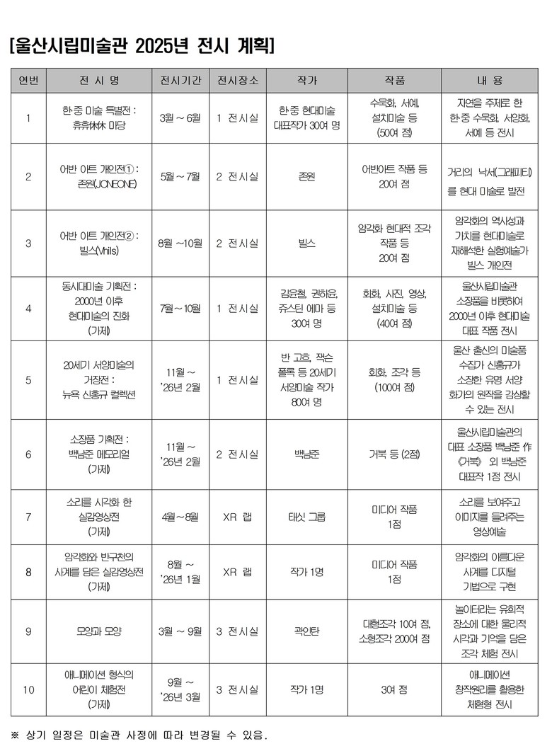 한편, 울산시립미술관은 지역미술 진흥 및 지역사회와의 협력망 강화를 위해 ‘지역신진작가 지원 공모 사업 : 대면_대면 2025’ 및 ‘원도심 활성화 사업’을 추진한다. 또한 전시 연계 및 소장품 교육프로그램을 정기적으로 운영하고, 유아·청소년·성인 등 전 생애주기별 문화예술교육과 교육청 연계 프로그램을 운영한다.