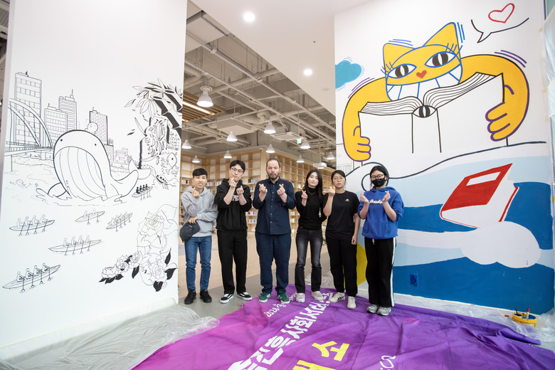 | ▲ 2024년 웹툰 작가 양성사업 수료 작가들과 세계적인 아티스트 토마뷔유는 지난 3월 19일 울산어린이청소년도서관 벽화 작업에 참여했다. |