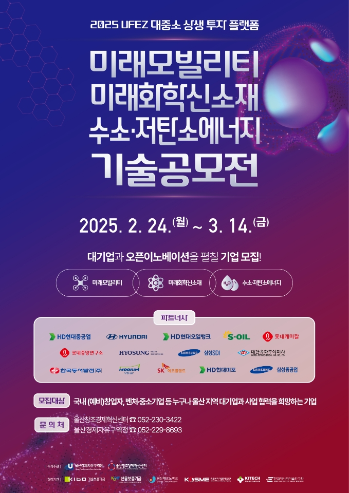 새싹기업(스타트업) 대상…3월 14일까지 접수 [울산 세계타임즈=이호근 기자] 울산경제자유구역청(이하 울산경자청)은 ‘2025년 울산경제자유구역(UFEZ) 대중소 상생 투자 기반(플랫폼) 공모전’을 개최한다고 밝혔다.