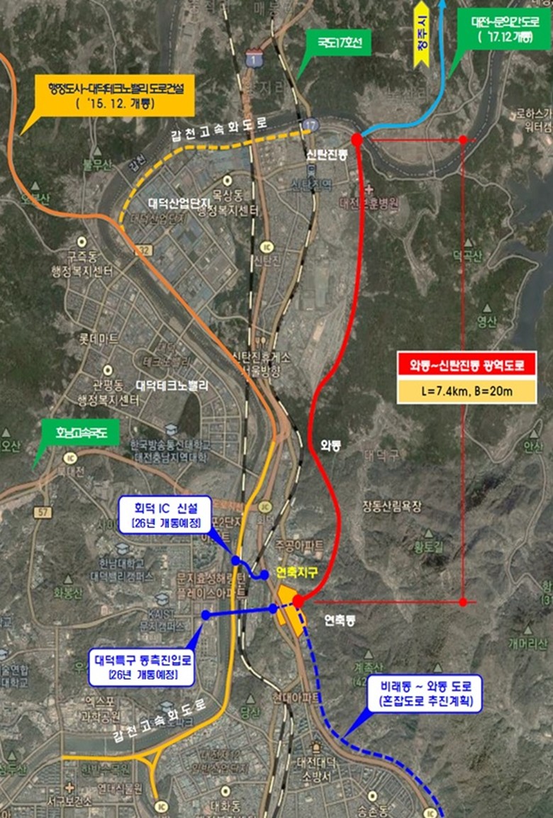 대전시는 사업 추진을 위해 지속적인 보완과 재정비를 이어왔다. 해당 사업은 2017년 예비타당성조사에서 경제성 미확보(B/C 0.85, AHP 0.431)로 추진에 제동이 걸렸지만, 이후 교통 여건 변화와 지역 개발 수요를 반영해 2025년 타당성조사 및 기본계획을 재수립하며 사업성을 보완했다. 특히 최근 연축지구 개발과 산업.주거 수요 증가로 해당 구간의 교통 수요가 크게 늘어나면서, 도로 신설의 필요성이 더욱 커졌다는 점이 이번 재추진의 배경으로 작용한 것으로 풀이된다.