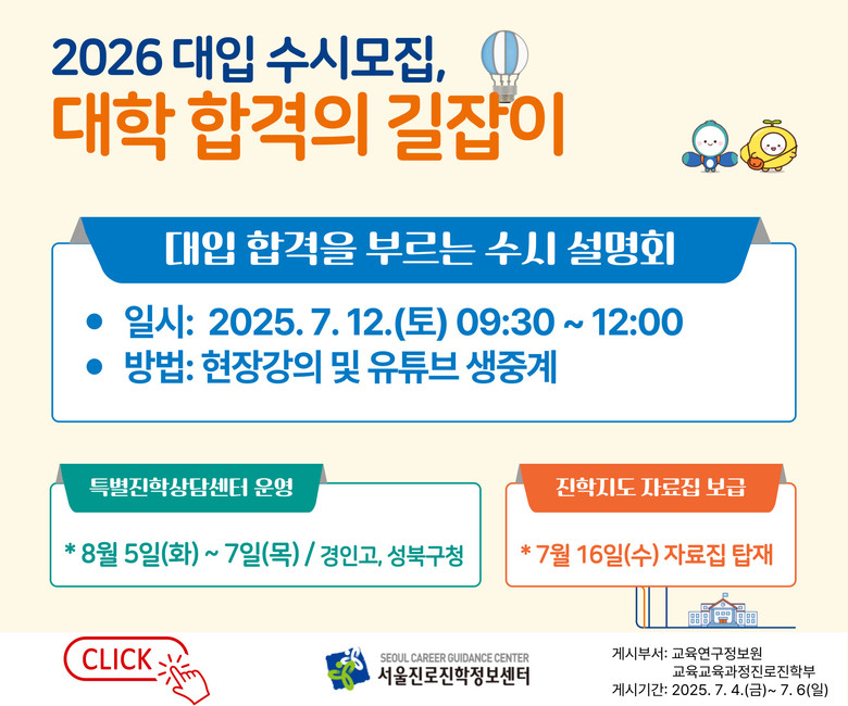 「2026 대입 수시모집 대비 진학지도 자료집」은 수시 진학지도 길잡이(1종), 대학별 분석(3종), 진학지도의 이해와 대비(1종) 등 총 5종으로 구성되며, 진학 담당 교사뿐만 아니라 수험생·학부모도 활용할 수 있도록 서울진로진학정보센터 누리집(jinhak.sen.go.kr)에 7월 16일(수) 이후 탑재될 예정이다.