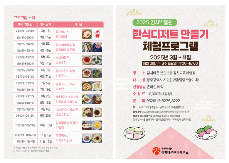 각 교육·체험 프로그램들은 온라인 사전예약제로 운영된다. 수강료와 일정 등 자세한 사항은 광주김치타운 누리집(www.gwangju.go.kr/kimchitown)을 통해 확인할 수 있다. 광주시는 어려운 경제여건을 감안하고 시민의 부담을 줄이기 위해 대부분의 프로그램 수강료를 동결했다.