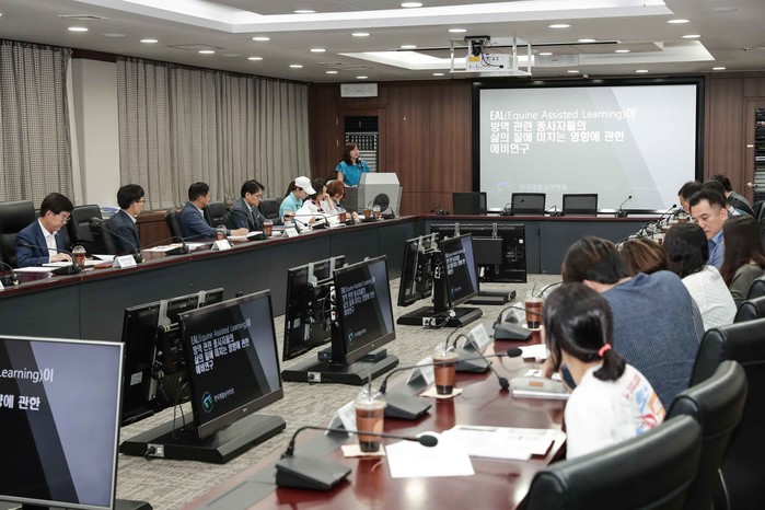 [세계타임즈 김인수 기자]한국마사회(회장 김낙순)가 8일(목) 과천소재 본관에서 방역직무 종사자 대상 힐링승마 연구 결과 발표회를 개최했다. 한국마사회 김낙순 회장과 임직원 그리고 가축위생방역지원본부(이하 방역본부) 관계자, 힐링승마 참가자 등 20여 명이 모여 연구결과를 발표하고 논의를 진행했다.