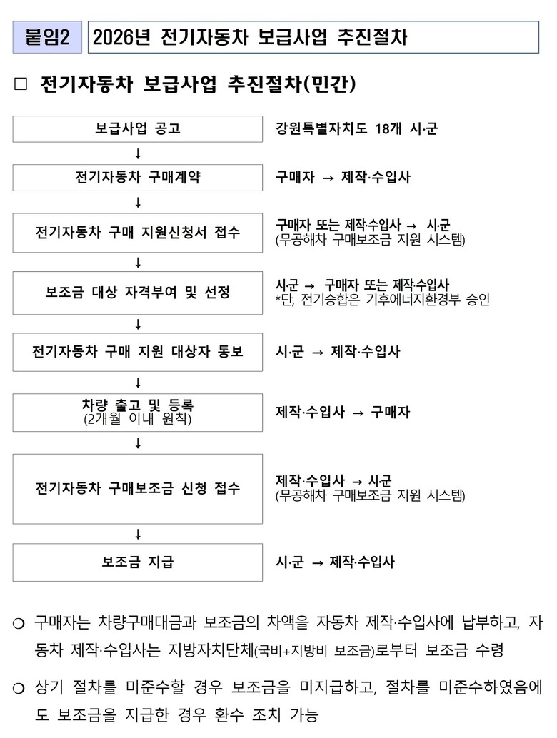 전기자동차 보조금 신청.접수는 2월 초부터 시군에서 추진되며 신청에 대한 자세한 사항은 무공해차 통합 누리집(https://ev.or.kr) 또는 시군 홈페이지 공고문을 통해 확인 할 수 있다. 아울러, 올해부터 법인·개인사업자의 전기승합차 보급사업은 환경공단에서 추진한다.