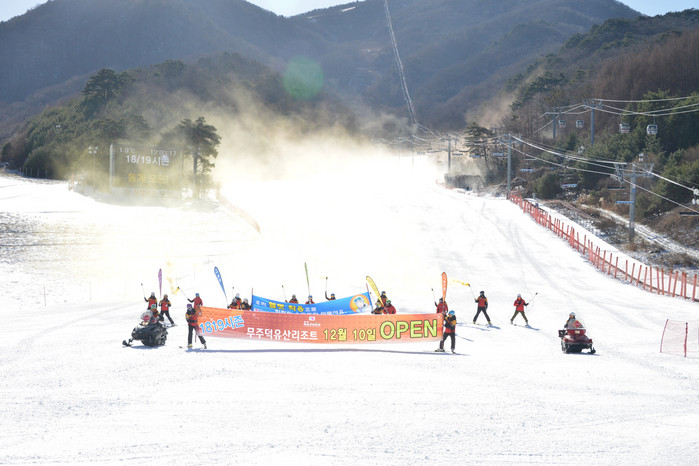 무주덕유산리조트가 10일 18/19 동계 시즌을 팡파르했다. 11월 말 날씨가 포근해 개장이 2주 가량 늦어졌다. 스키 전문요원 20여명이 래드, 화이트, 옐로 등 다양한 색상의 연막스키를 들고 스피츠하단 슬로프를 내려오며 개장 팡파르를 울렸다. 이날 평일임에도 불구하고 700여명이 스키장을 찾아 성황을 이뤘다.