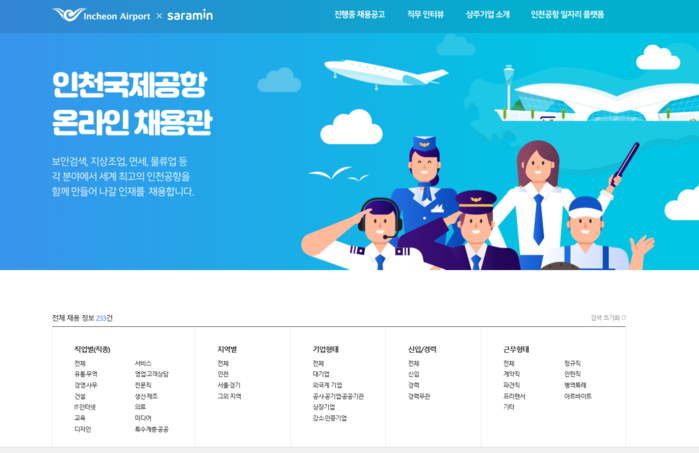 인천공항 온라인 채용관은 국내 최대 취업포털 사람인과 함께 운영 중으로, 진행 중인 인천공항 구인공고를 한눈에 확인 할 수 있으며 주기적으로 신규서비스를 도입하는 등 구인기업-구직자의 편의성을 강화하고 있다.