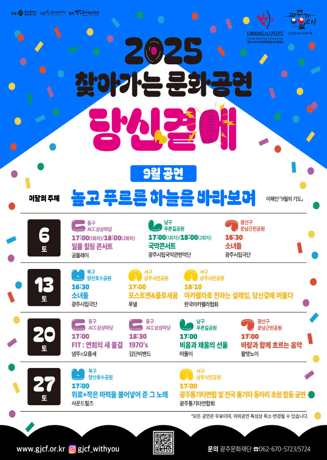‘찾아가는 문화공연’은 9월부터 11월까지 매주 첫째·셋째주 토요일 동구 국립아시아문화전당(ACC) 상상마당, 남구 푸른길공원, 광산구 운남근린공원에서, 둘째·넷째 주 토요일 서구 상무시민공원, 북구 양산호수공원에서 총 31회 공연을 진행한다.