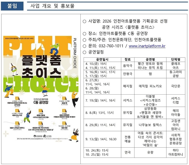 인천아트플랫폼 관계자는 “〈플랫폼 초이스〉는 공연예술단체의 창작활동을 지원하는 동시에 시민의 문화 향유 기회를 확대하기 위한 프로그램”이라며 “특히 가족 단위 관객이 함께 즐길 수 있는 참여형 공연을 통해 보다 친근하게 공연예술을 접할 수 있는 계기가 되길 바란다.”고 밝혔다.