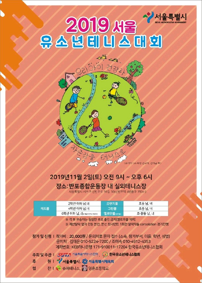 서울특별시체육회(회장 박원순)가 오는 11월 2일(토) 서초구 반포종합운동장 테니스장에서 서울시 유소년(만 6세~15세) 200명, 임원 및 심판 50명 등 총 250명이 참가하는 ‘2019 서울 유소년 테니스 대회’를 개최한다.