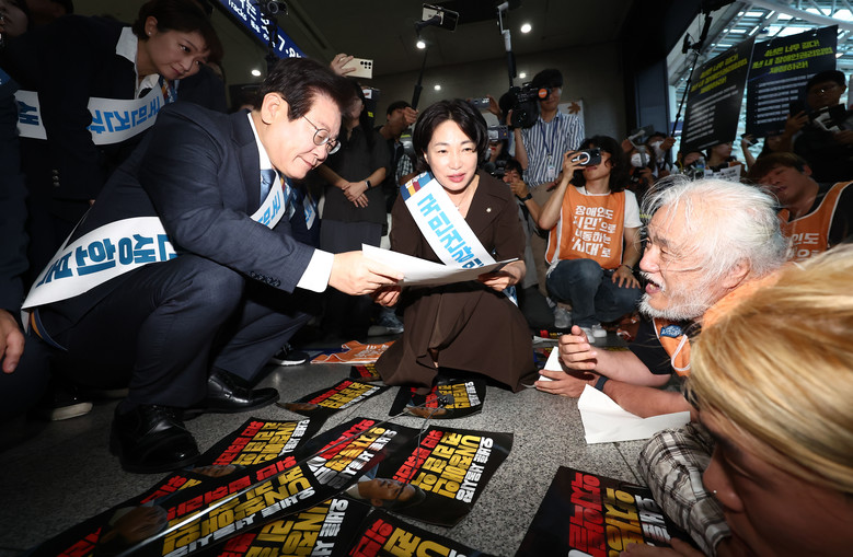 [세계타임즈 = 신상철 기자] 더불어민주당 이재명 대표가 13일 오전 서울 용산역에서 추석 귀성인사를 하던 도중 박경석 전국장애인차별철폐연대(전장연) 대표로부터 7대 장애인권리입법 내용이 담긴 서류를 받고 있다. 2024.9.13 [공동취재]