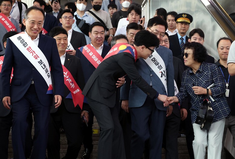 [세계타임즈 = 신상철 기자] 13일 오전 서울역 KTX 대합실에서 국민의힘 한동훈 대표와 지도부가 추석 귀성 인사를 하고 있다. 2024.9.13 [공동취재]