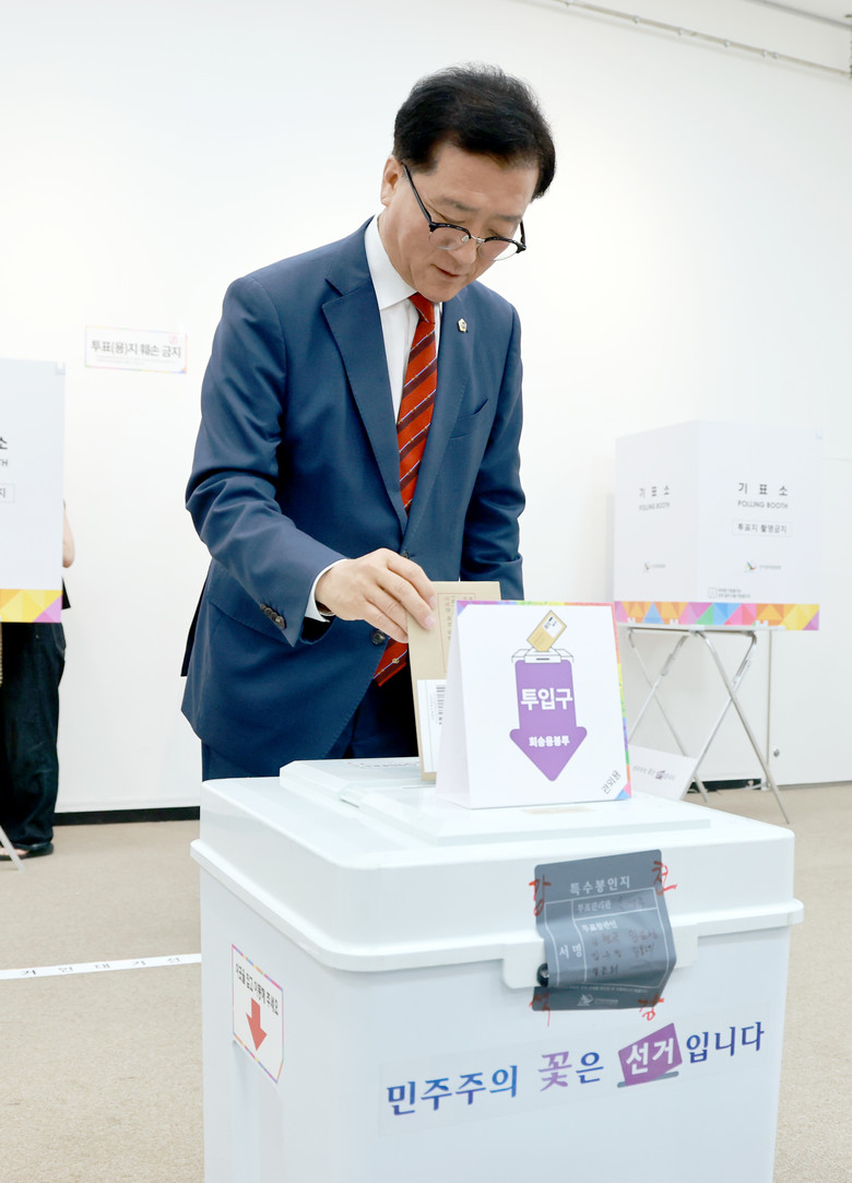 [대전 세계타임즈=이채봉 기자] 대전시의회 조원휘 의장은 제21대 대통령선거 사전투표 첫날인 29일 대전시청 1층 전시실에 마련된 둔산1동 사전투표소를 방문해 투표에 참여했다.