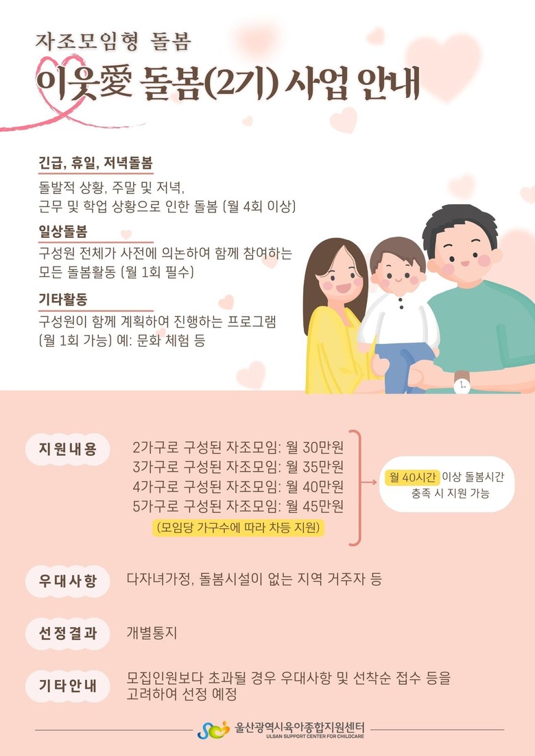 기타 자세한 사항은 울산광역시육아종합지원센터(☏266-4168)로 문의하면 된다.