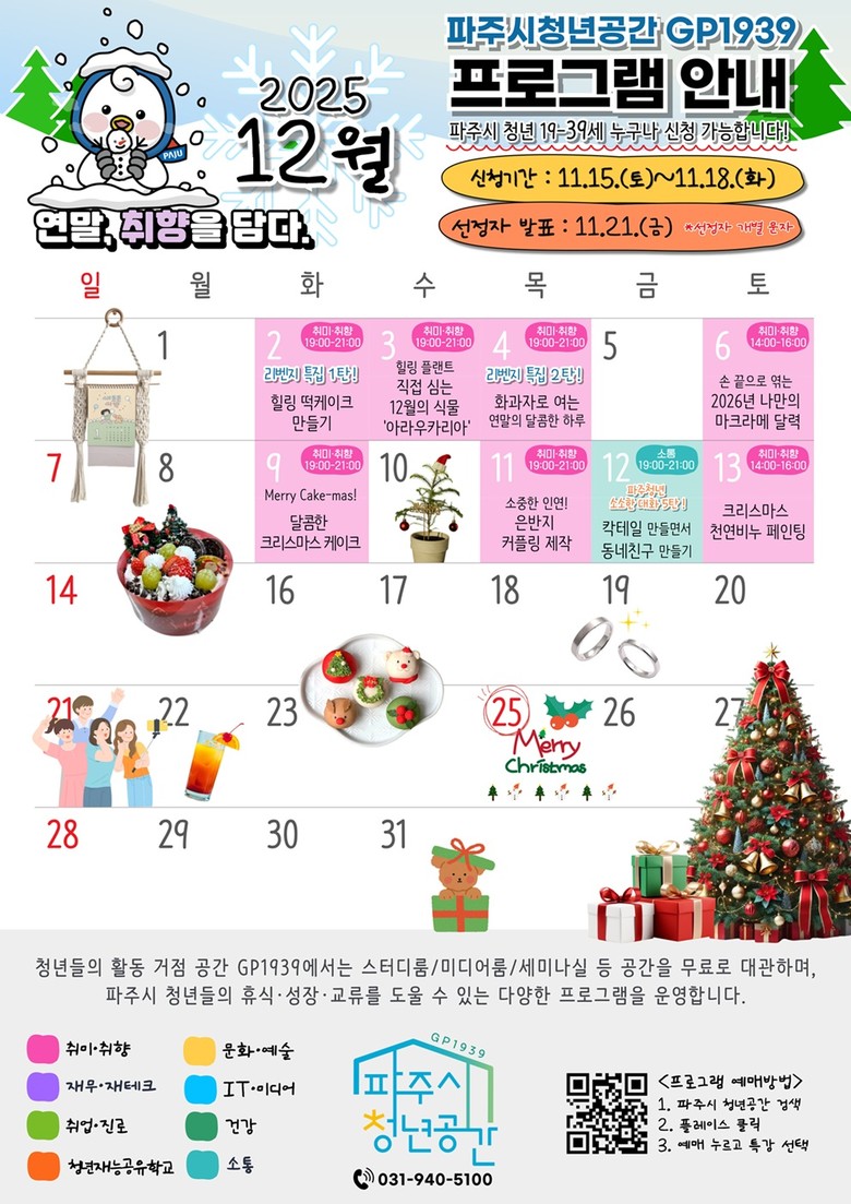 김지숙 청년청소년과장은 “올해 마지막 프로그램을 통해 청년들이 스스로의 취향을 발견하고, 따뜻한 교류의 시간을 가지길 바란다”라며 “청년공간이 연말의 특별한 추억을 만드는 거점이 될 것”이라고 말했다.