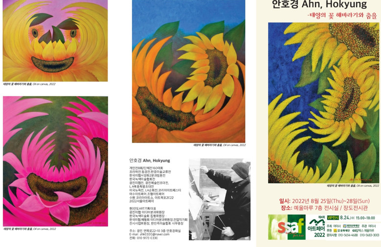 '태양의 꽃 해바라기와 춤을' 작품으로 전시를 하는 안호경 작가는 "태양을 만날 때면 환희에 찬 광경이 새롭게 힘을 얻는 원천이 되어 그 기운을 해바라기 작품에 담아 행복을 찾아가는 매개체로 삼고자 했다. 해바라기는 태양의 꽃이기도 하지만 숭배의 대상 그리고 물질의 풍요이며 동경과 기다림의 상징으로 따뜻한 감성이 관람객들에게 느껴지길 바란다."고 말했다. 작가는 개인전 8회, 단체전 160여회 진행한 중견 작가로 광진미협 미디어분과위원장, 한국녹색미술회집행위원장, 한민족미술협회 사무총장 등 한국미술 발전에도 활동을 적극적으로 하고 있다.