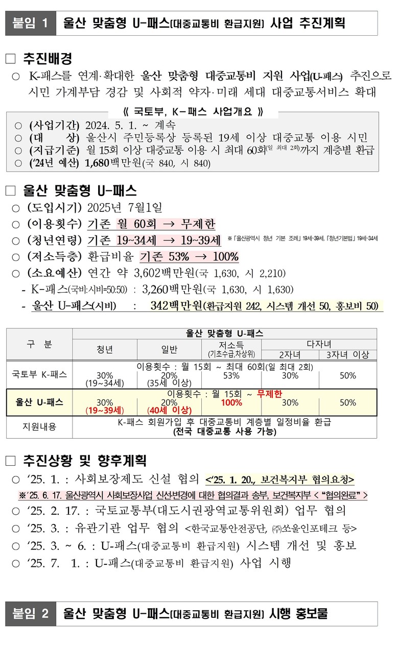 울산시 관계자는 “앞서 시행 중인 어린이 및 75세 이상 어르신 대상 시내버스 요금 무료화에 이어, 울산 유(U)-패스가 교통비 부담을 줄이고 취약계층 이동권을 실질적으로 보장하는 계기가 될 것”이라며 “혜택 대상자가 최대한 지원을 받을 수 있도록 홍보와 시행 준비에 만전을 기하겠다”라고 말했다.