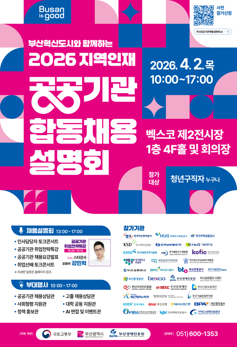 [부산 세계타임즈=이용우 기자] 부산시(시장 박형준)는 오늘(2일) 오후 2시 벡스코 제2전시장에서 부산 혁신도시와 함께하는 「2026 지역인재 공공기관 합동채용설명회」(이하 설명회)를 개최한다고 밝혔다.