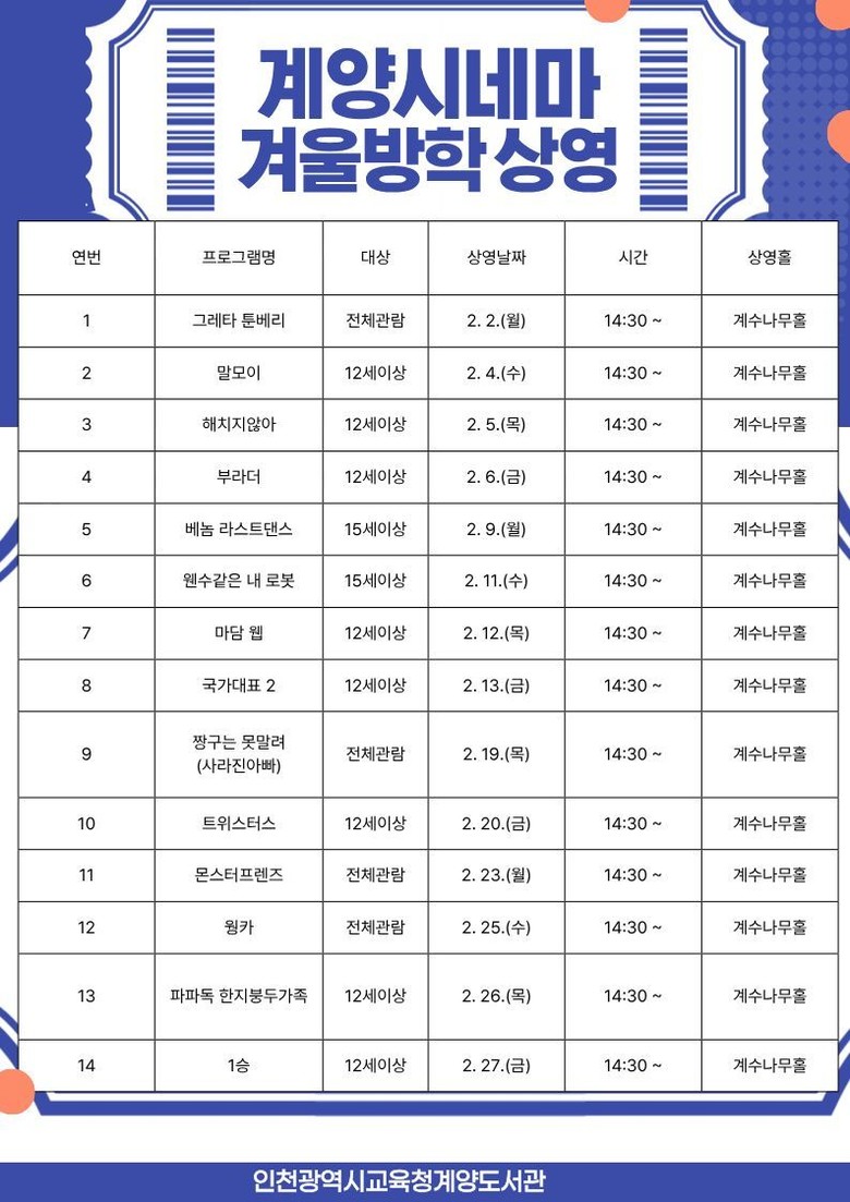 먼저,‘겨울방학 계양시네마’는 휴관일을 제외한 2월 한 달간 운영하며, 계수나무홀에서 온 가족이 즐길 수 있는 다양한 장르의 영화 14편을 상영할 예정이다.