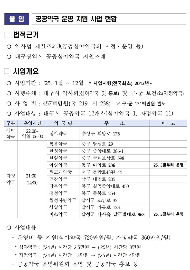 대구시는 공휴일 및 심야시간에 시민들의 의약품 구입 불편 해소 및 약사의 상담 및 복약지도를 통한 안전한 의약품 사용을 위해 대구광역시 약사회 및 보건소와 협력하여 공공약국을 지정·운영하고 있다.