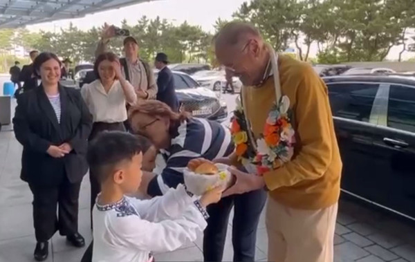 오전 10시 30분 E게이트 입국장에 모습을 나타낸 최고위급 인사는 에밀 콘스탄티네스쿠 전 루마니아 대통령이었다. 그를 환영하기 위해 미리 와있던 HWPL 청년들의 환영 인사에 에밀 콘스탄티네스쿠 전 대통령 내외는 환한 미소로 손을 흔들며 화답했다. 곧이어 의전이 꽃목걸이를 걸어주자 통역과 경호팀은 에밀 콘스탄티네스쿠 전 대통령 내외와 수행원을 의전 차량이 준비된 3층으로 안내했다.