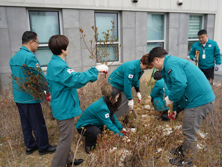 이날 행사에서는 청사 3층 정원 식목 및 화단 정리, 1·2층 입구 대형 화분 꽃 심기 활동이 진행되었으며, 철쭉·데이지·작약 등 다양한 식물을 식재하여 봄철 청사 경관을 개선하였다.