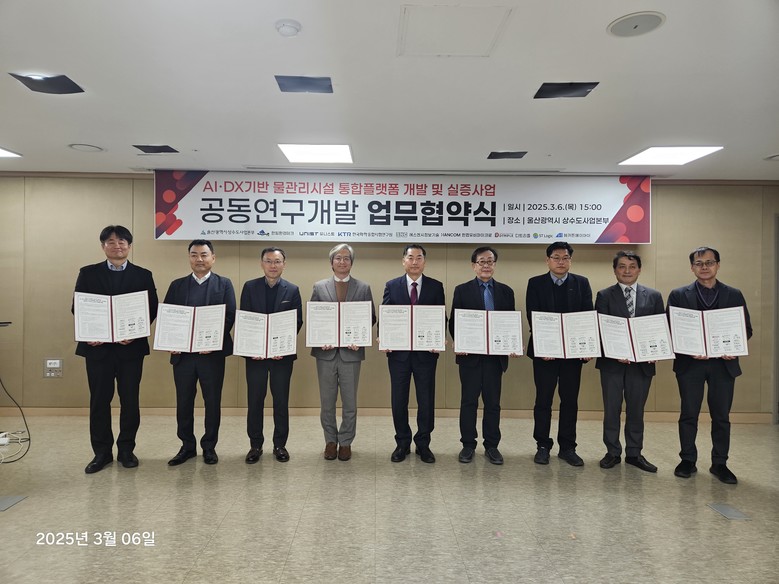 [세계타임즈=울산 이호근 기자] 울산시 상수도사업본부는 3월 6일 오후 3시 상수도사업본부 4층 중회의실에서 울산과학기술원 및 지역 유수 기업, 연구기관과 ‘인공지능(AI)·디지털전환(DX)기반 지능형(스마트) 물관리 기술개발 및 실증사업’업무 협약을 체결한다고 밝혔다.