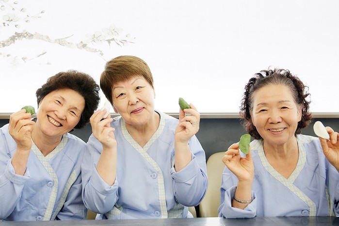 | ▲ 강남자생한방병원 환자들이 ‘추석 맞이 송편 빚기 행사’에 참여해 송편을 만들며 포즈를 취하고 있다. |