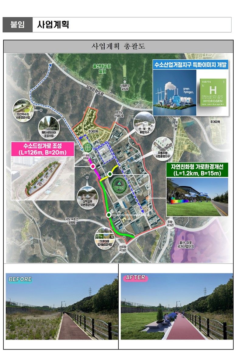 울산경자청은 한국산업단지공단과 7월 내 협약을 체결하고 국비가 교부되는 대로 특화디자인도입과 기본 및 실시설계를 거쳐 내년부터 2027년까지 ‘수소드림가로 조성’과 ‘자연친화형 가로환경개선사업’을 시행할 예정이다.