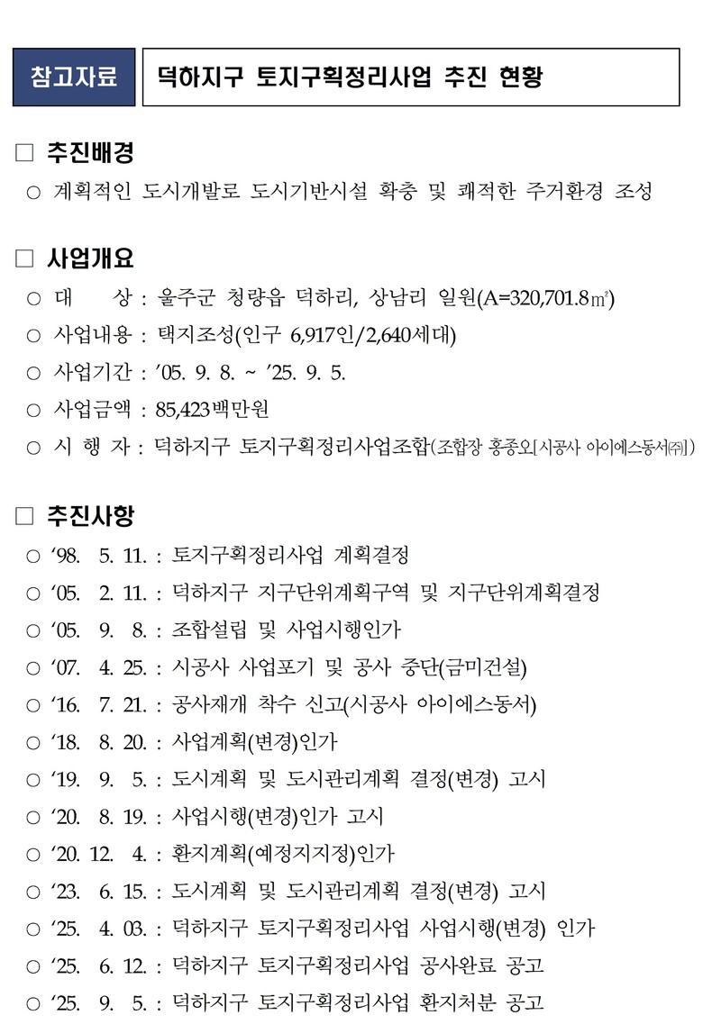 이 사업은 지난 1998년 5월 11일 덕하지구 토지구획정리사업 도시계획 결정 이후 2005년 9월 8일 토지구획정리사업 사업시행인가를 득했으나 시공사의 사업 포기로 사업이 중단된 바 있다.