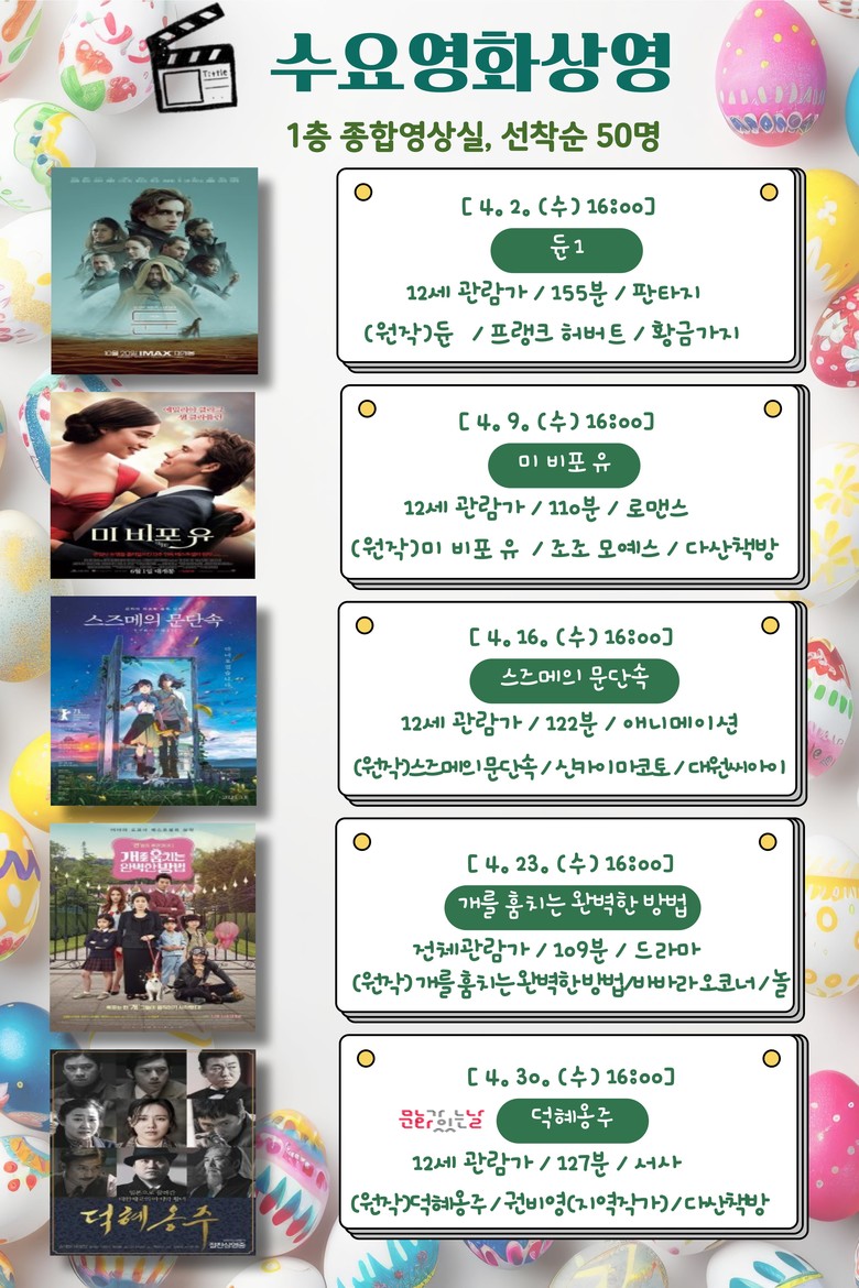 수요영화는 4월 한 달간 매주 수요일 오후 4시, 울산도서관 1층 종합영상실에서 진행되며 총 5편의 영화가 상영된다.