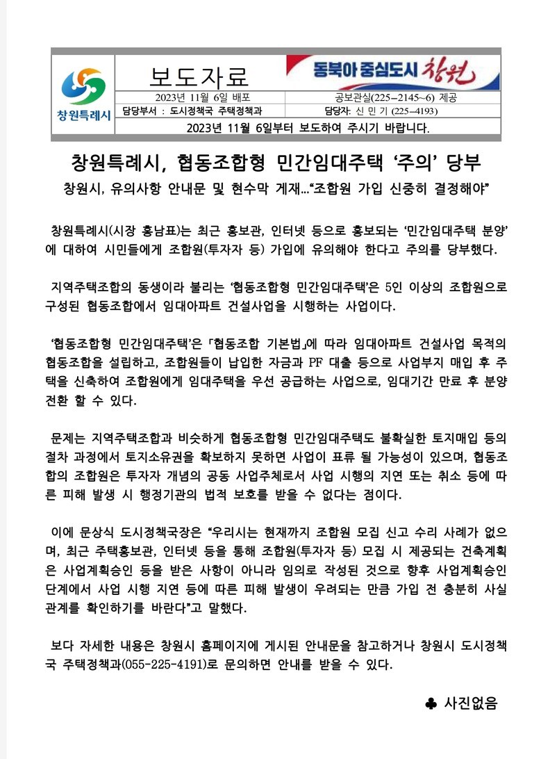 ▲창원시가 지난 6일 협동조합형 민간임주택 '주의' 당부라는 제목의 보도자료