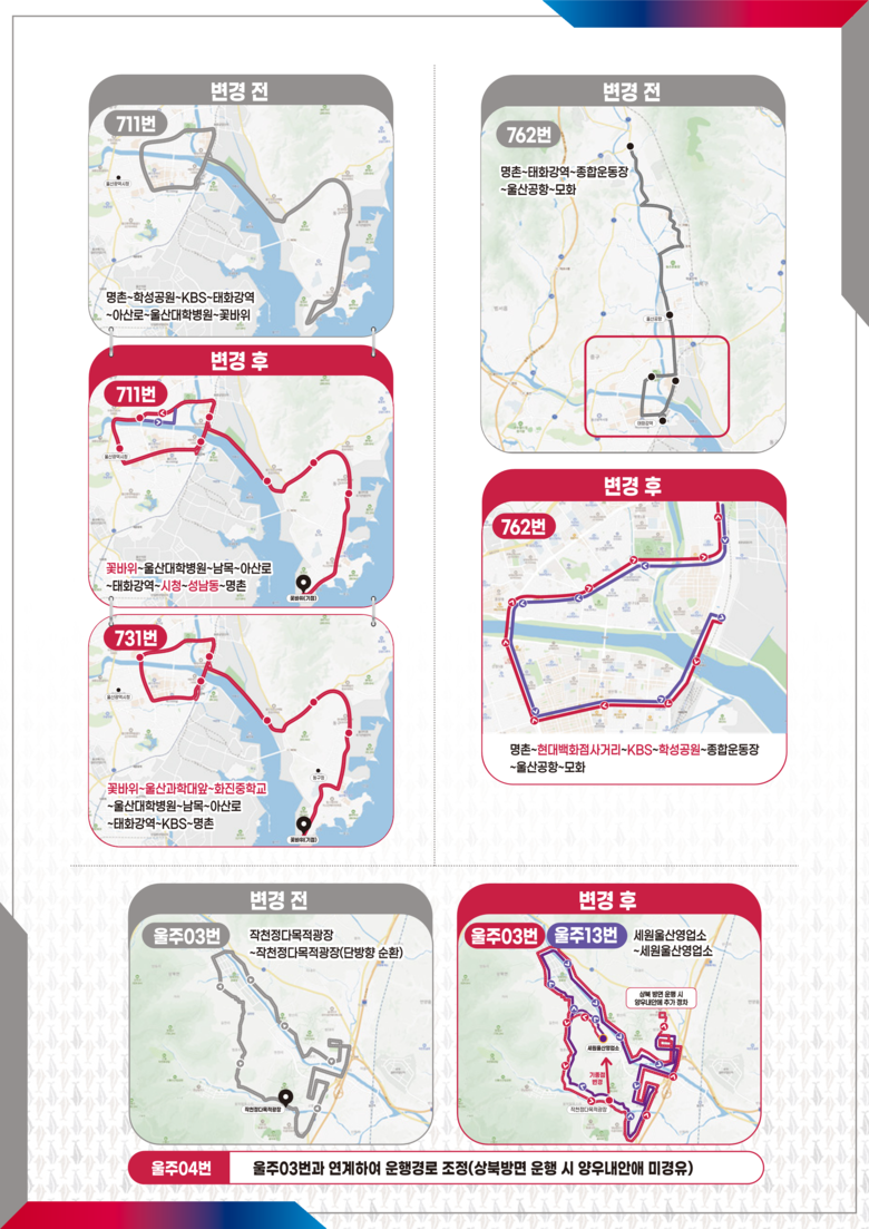 북구지역에서는 농소2동(이화, 모화)에서 삼산으로의 이동 편의 증진을 위해 762번 노선을 조정한다. 당초 학성교, 보람병원, 태화강역 방면으로 운행하던 경로가 학성공원, 번영교, 케이비에스(KBS), 현대백화점사거리를 경유하도록 변경된다.