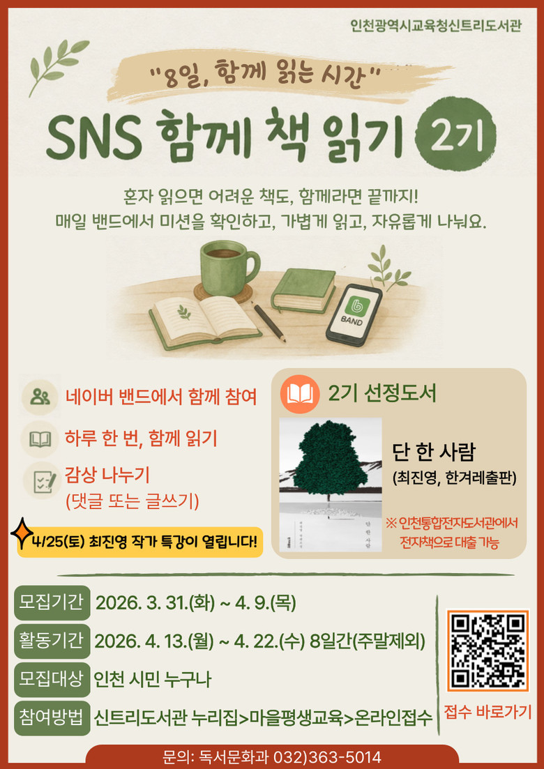 [인천 세계타임즈=심하린 기자] 인천광역시교육청신트리도서관(관장 정경애)은 시민의 일상 속 독서 활성화를 위하여, 3월 31일부터 온라인 참여형 독서 프로그램 ‘SNS 함께 책 읽기’ 2기 참여자를 모집한다.