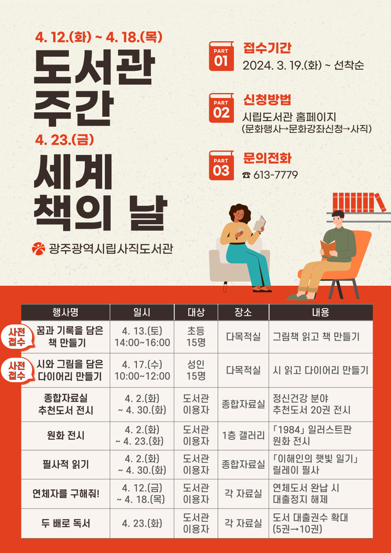 강연 및 체험 행사 접수는 광주시립도서관 누리집에서 할 수 있다. 자세한 내용은 각 도서관(무등 062-613-7727, 사직 062-613-7779, 산수 062-613-7814)으로 문의하면 된다.