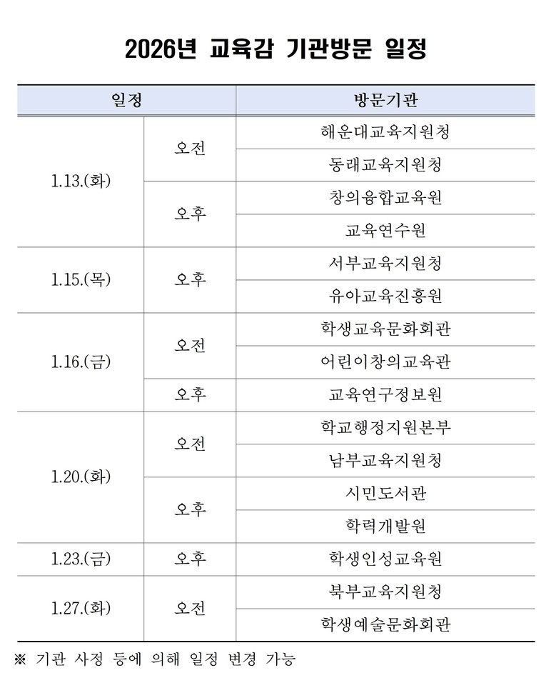 이번 기관 방문은 부산교육 정책의 현장 적합성을 높이고 기관 간 소통을 활성화해 교육 현장의 수요를 정책에 충실히 반영하기 위해 마련했다. 이 자리에서는 2026년 기관별 주요 업무 보고에 이어, 주요 현안을 중심으로 토의·토론을 진행할 예정이다.