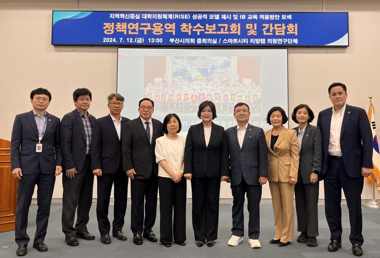 임말숙 대표 의원은 “이번 연구 주제는 교육적 측면에서 부산형 스마트시티 구현을 어떻게 할 수 있을까 하는 고민에서 출발했다”며, “2022년 진행한 용역 결과와 저출생에 따른 인구 변화 속에서 지역과 대학이 처한 현실을 극복하기 위한 방안 중 하나인 RISE가 상당히 중요하다는 점에서 이 연구 방향을 설정하게 되었다”고 했다. 더불어 “성공적인 RISE 모델 구축을 위한 방안 중 하나로 IB교육 방식에 대한 심도 있는 분석과 정책적 활용 방안을 제시해 주시기 바란다”고 당부했다.