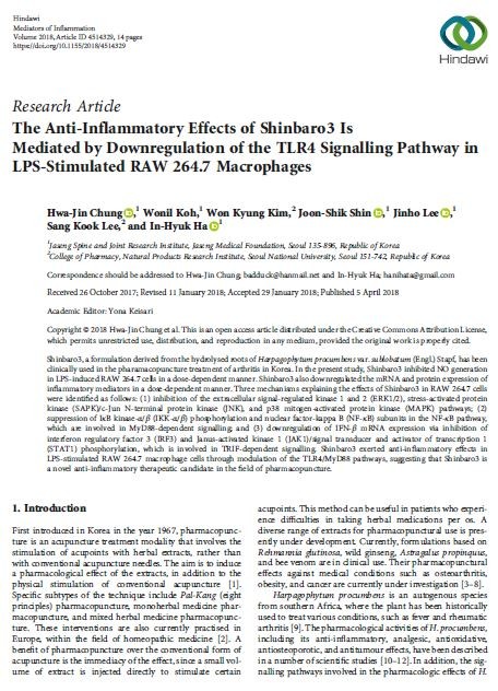 자생한방병원 척추관절연구소(소장 하인혁) 정화진·고원일 연구팀은 천수근을 가수분해하여 조제한 신바로3가 갖는 임상적 효능이 어떻게 나타나는지 그 과학적 기전을 규명했다고 16일 밝혔다. 이번 연구성과는 염증조절 관련 SCI급 국제학술지 ‘Mediators of Inflammation(IF=3.232)’ 최신호(4월호)에 게재됐다.