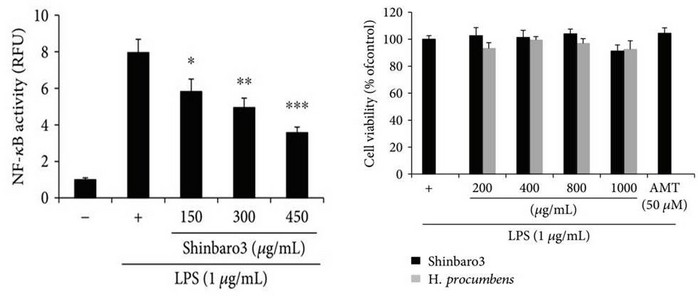 또 염증 유발에 관여하는 유전자 COX2와 iNOS의 발현도 차단됐다. COX2, iNOS 등 염증성 매개물질의 전령 RNA(mRNA) 발현이 LPS 자극에 의해서 상승됐지만 신바로3 처리를 한 결과 다시 감소했다. TNF-alpha 및 IL-1beta와 같은 염증성 사이토카인도 염증 과정의 매개에 있어 중요한 역할을 수행하는데 염증성 사이토카인의 mRNA 발현도 LPS 자극에 의해서 상승했지만 신바로3에 의해 감소하는 항염증 효과를 나타냈다.
