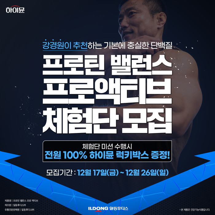 [세계타임즈 김인수 기자]일동후디스가 기본에 충실한 단백질 보충제 ‘하이뮨 프로틴 밸런스 프로 액티브(이하 하이뮨 프로 액티브)’ 체험단을 오는 26일(일)까지 모집한다고 밝혔다.
