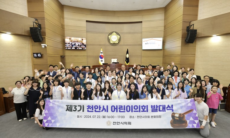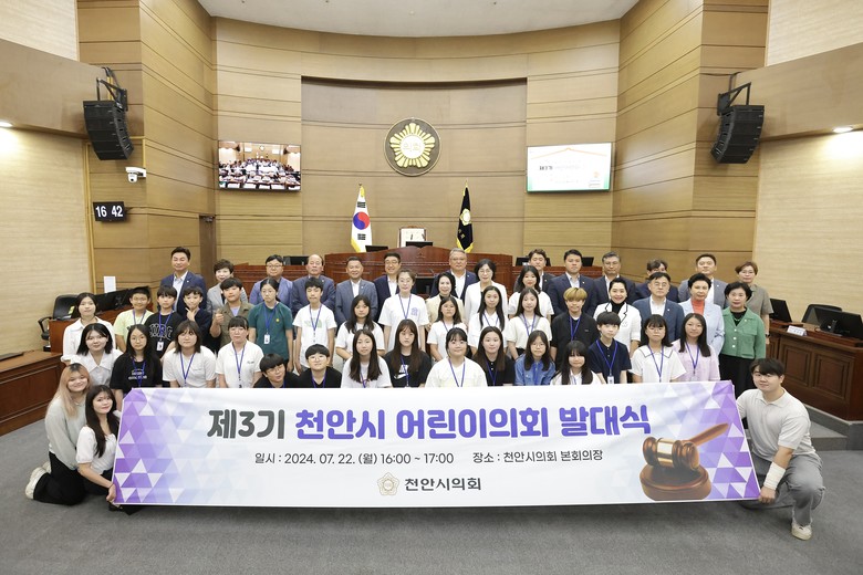 천안시의회는 2024년 제3기 천안시 어린이의회를 모집하며 3회에 걸친 정책 발굴 교육에 국회 견학을 추가하여 더 수준 높은 활동 기회를 제공하여 21세기를 이끌어 갈 천안의 어린이들에게 더 큰 비전을 심어주겠다는 포부를 밝혔다.