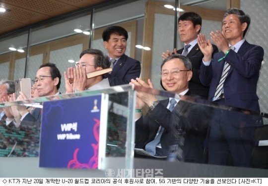 황창규 KT 회장은 20일 정몽규 FIFA U-20 월드컵 조직위원장 등 주요 인사와 함께 한국-기니 개막경기를 관람하고 경기장 내 5G 시범망을 관리하는 통신시설을 방문해 직원들을 격려했다.