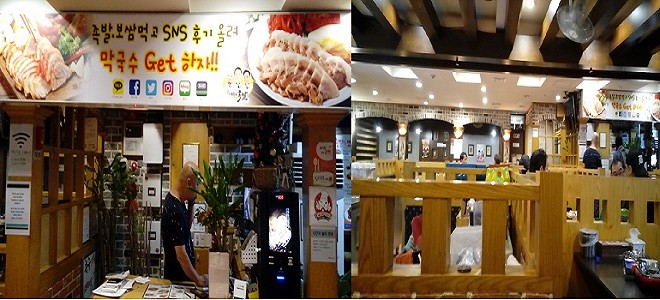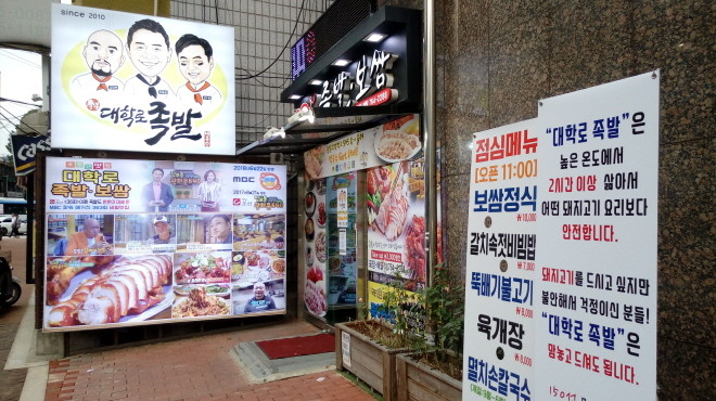 혜화동역 4번 출구를 나와 50M정도 로터리 방향으로 걸어가면 개그맨 이봉원과 김수용 사진이 걸린 큰 간판이 눈에 뜨인다. 대학로족발보쌈이라고 적힌 간판에 재미있는 캐릭터 그림이 발걸음을 멈추게 하는데, 입구에는 다양한 먹거리 안내판이 붙어 있어 자연스럽게 식감을 자극한다.