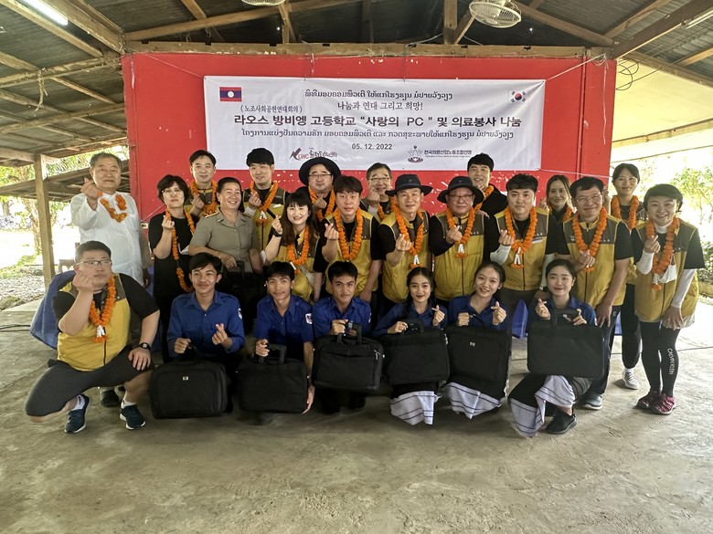 의료노련 봉사단은 5일 ‘의료봉사’와 ‘사랑의 의약품 배포’에 앞서 방비엥 고등학교에 교실용 컴퓨터 ‘사랑의 PC’ 20대를 한국노동복지센터와 함께 기증하였다. ‘사랑의 PC’ 기증 행사에는 방비엥 고등학교 솜퐁 탐마봉 교장 외 학생들과 주민 200여 명과 의료노련 의료봉사단, 한국노동복지센터 모두가 참석하여 기증식을 가졌다. 솜퐁 탐마봉 교장은 “1985년 개교 이래 노트북은 처음 기증받는다. 학생 수 935명에 교사는 39명인데 현재 컴퓨터 교실은 없고 교육 장비가 턱없이 부족하다. 교무 행정용 컴퓨터 2대를 교육용으로 활용하는 열악한 실정이다. 멀리 한국에서 찾아와 라오스의 어린 학생들을 위해 컴퓨터를 기증해 주고 의약품 기증과 의료 나눔까지 해주니 너무 감사드린다.”며 감사장을 전달했다.