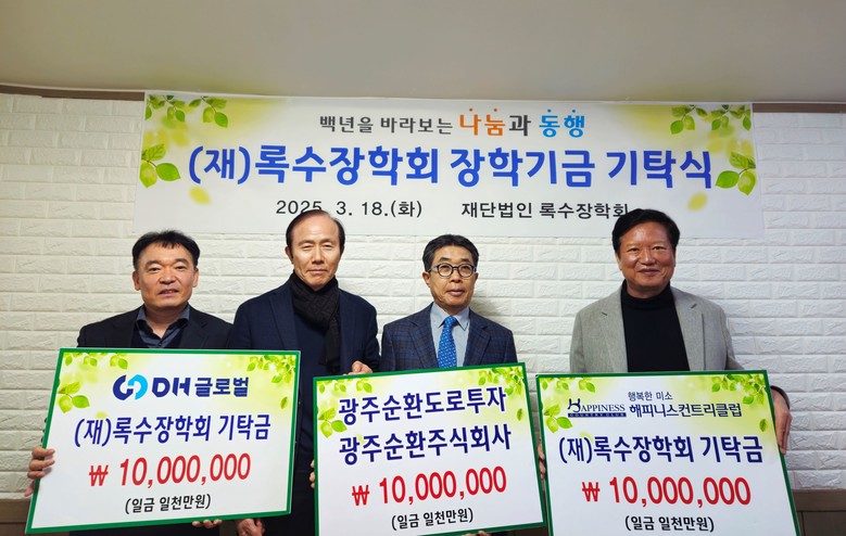 [광주 세계타임즈=손권일 기자] 광주광역시소방안전본부는 해피니스컨트리클럽㈜(회장 양진석), 광주순환㈜·광주순환도로투자㈜(대표 이영훈), ㈜DH글로벌(회장 이정권) 등 3개 회사 대표가 지난 18일 재단법인 록수장학회에 각각 1000만원씩 총 3000만원의 장학금을 기탁했다고 밝혔다.